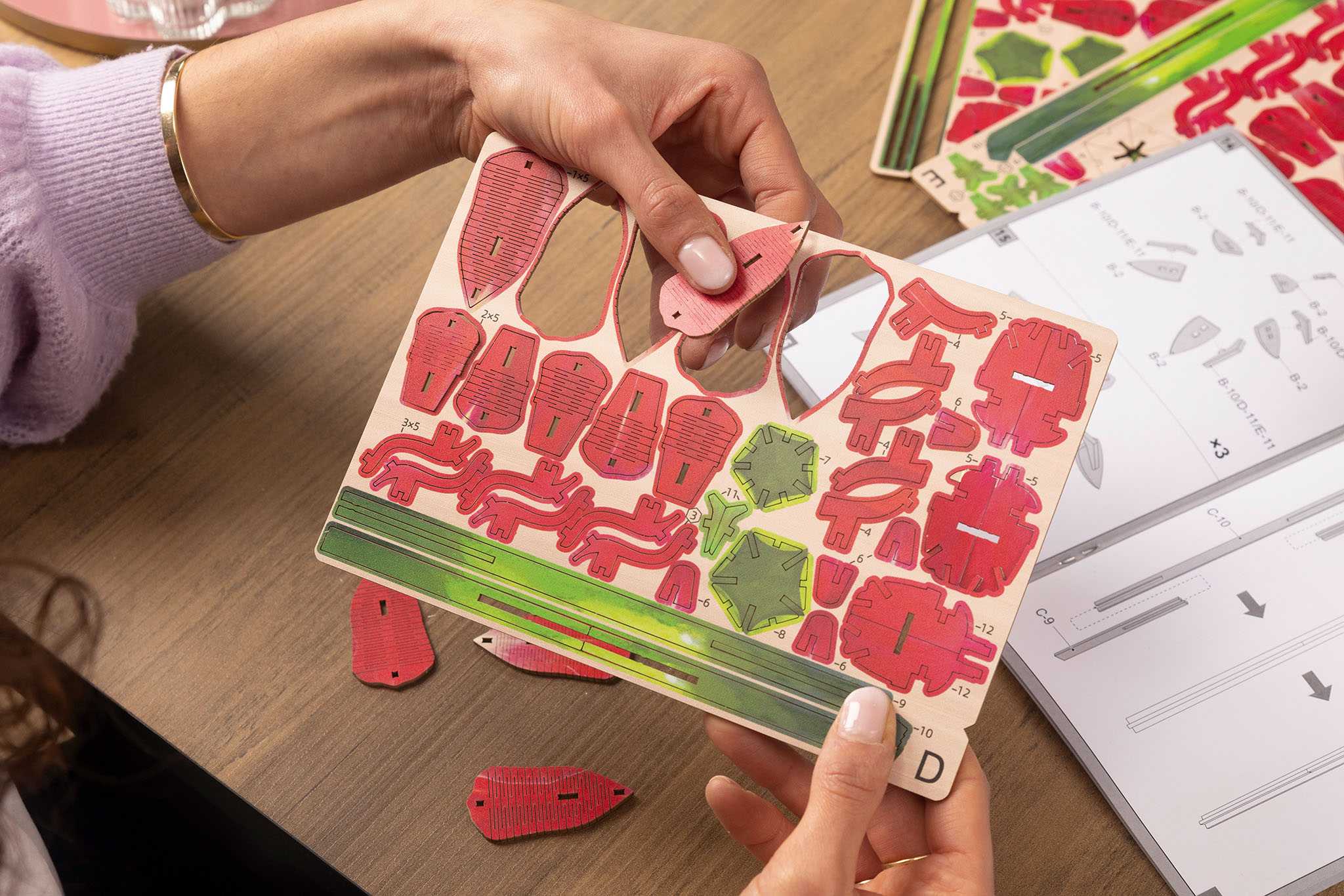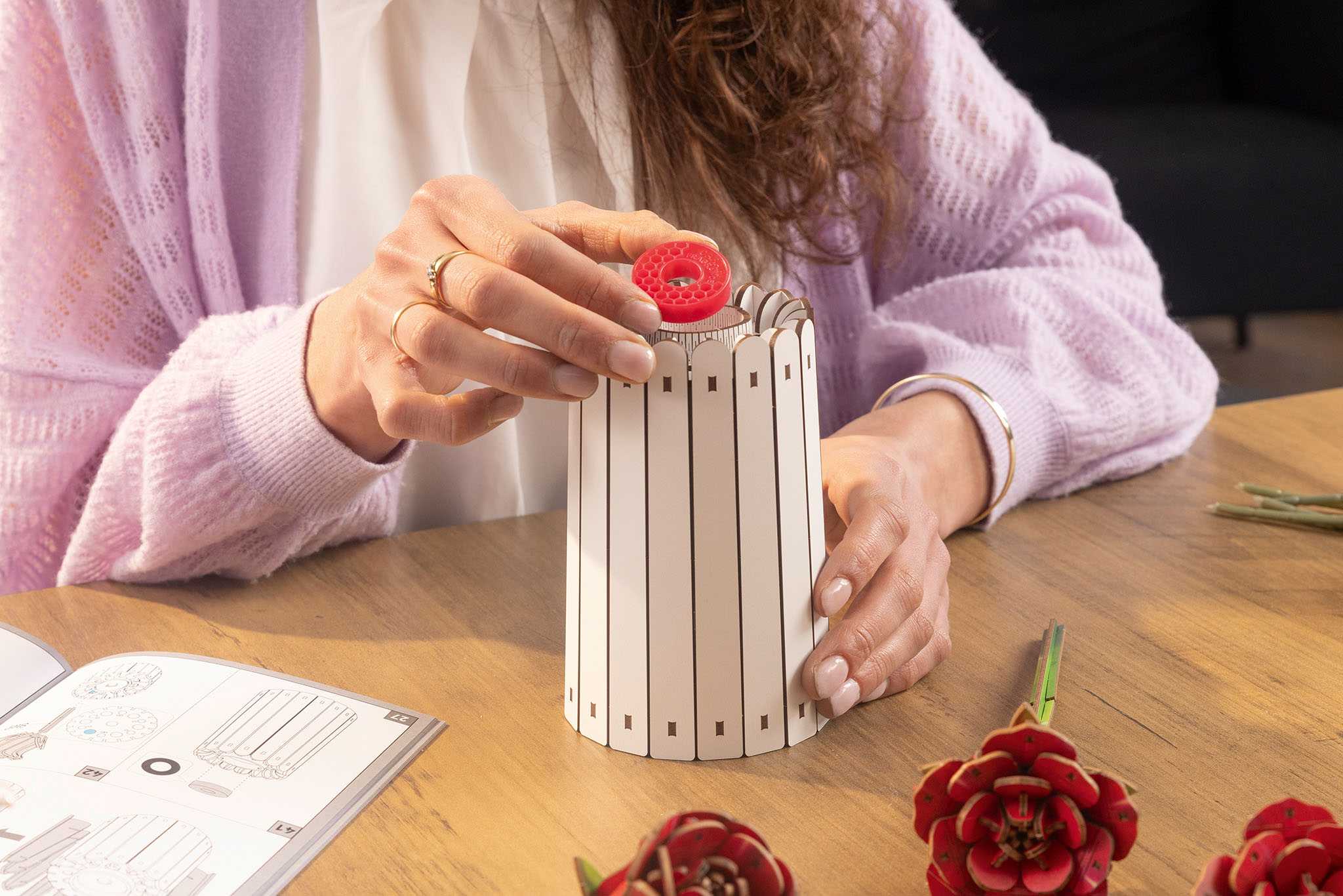 Struktura sady "Dream of Roses" je jako meditace. Kousek po kousku skládáte prvky dohromady a sledujete, jak ve vašich rukou kvete královna květin. S věkovým doporučením 14 let a více je to relaxační projekt pro mladé i dospělé. Na rozdíl od umělých plastových květin, dřevo vyzařuje kvalitu a teplo, které oživí každou místnost - ať už na jídelním stole, v ložnici nebo jako uvítací pozdrav v chodbě.